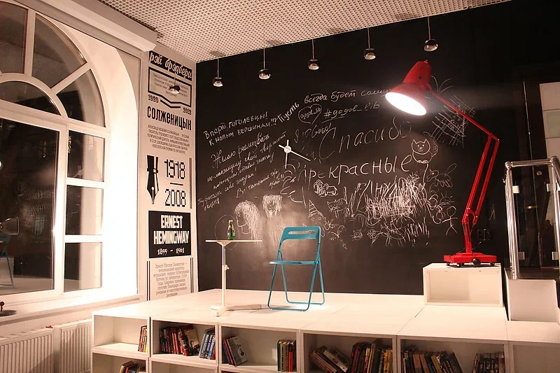 В Библиотеке имени Гоголя мы нанесли чёрное грифельное покрытие, превратив одну из стен в удобную зону для творчества и коммуникации. На такой поверхности можно писать мелом, оформлять афиши, оставлять объявления и создавать визуальные материалы для событий.