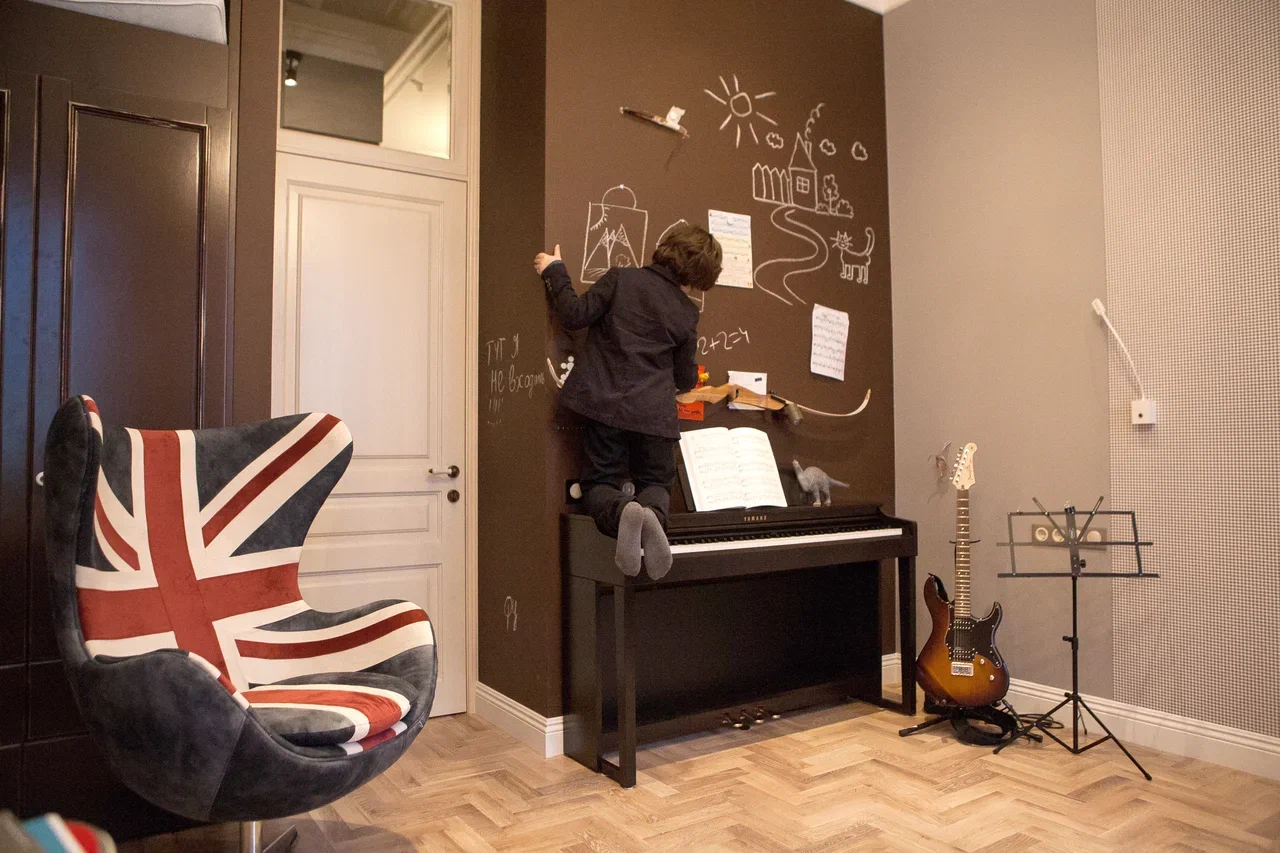 В детской комнате квартиры на М. Коковинском мы создали магнитно-грифельные поверхности в коричневых и оранжевых оттенках, превращая обычные стены в центр детской активности.