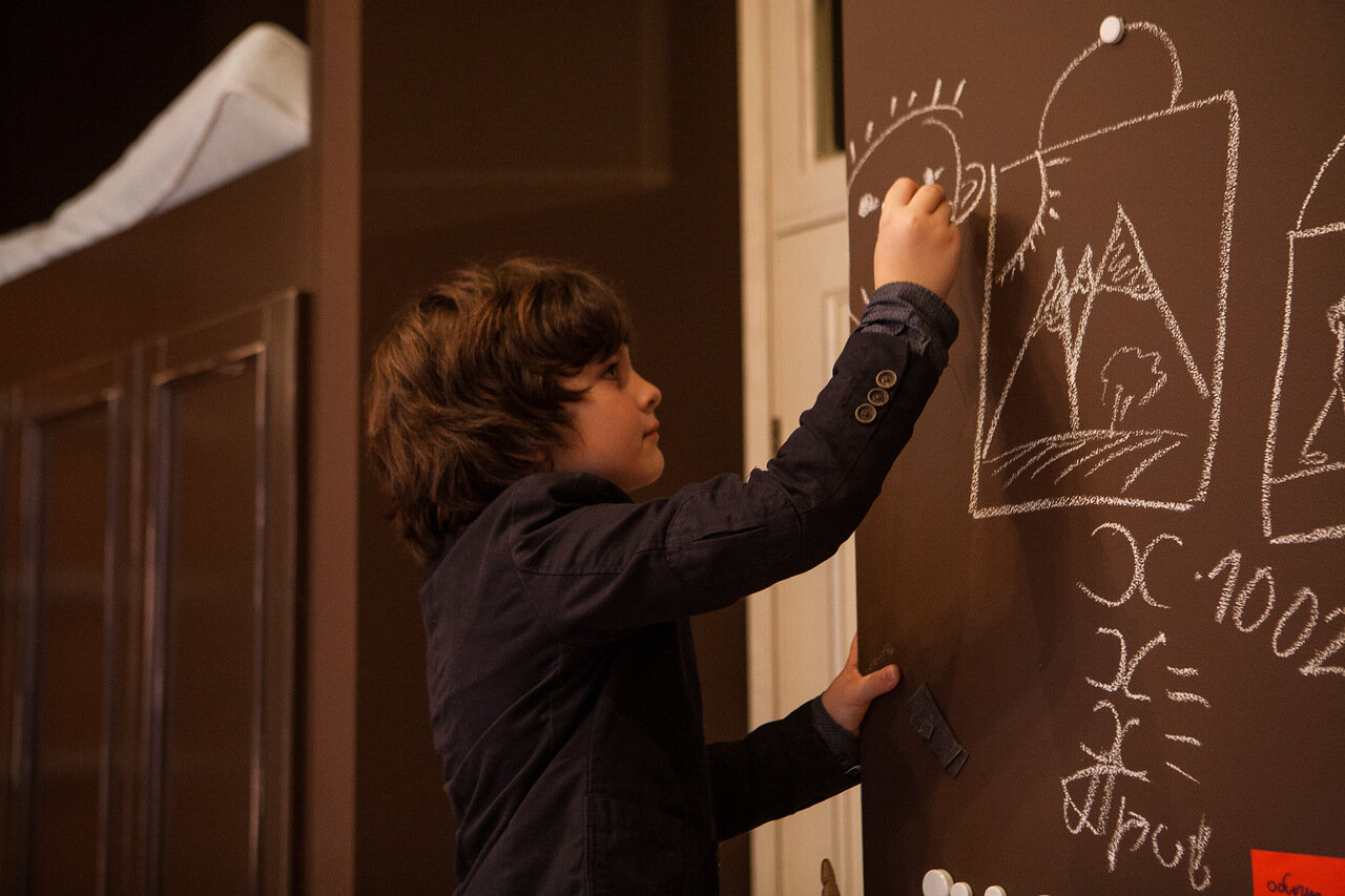 Теперь ребенок может рисовать мелом, прикреплять свои рисунки на магниты и записывать заметки прямо на стене. Пространство становится интерактивным и вдохновляющим, стимулируя воображение и креативное мышление.