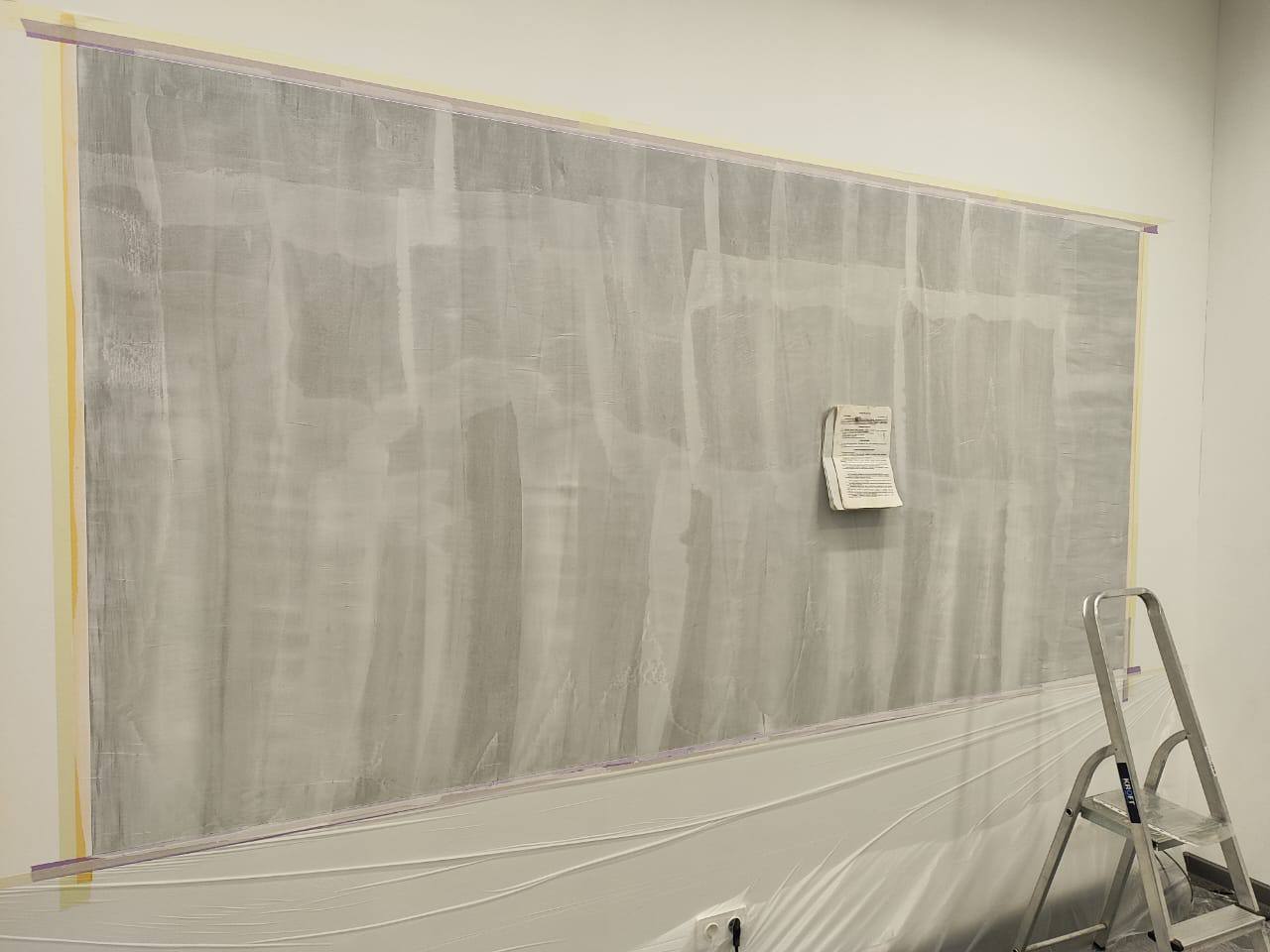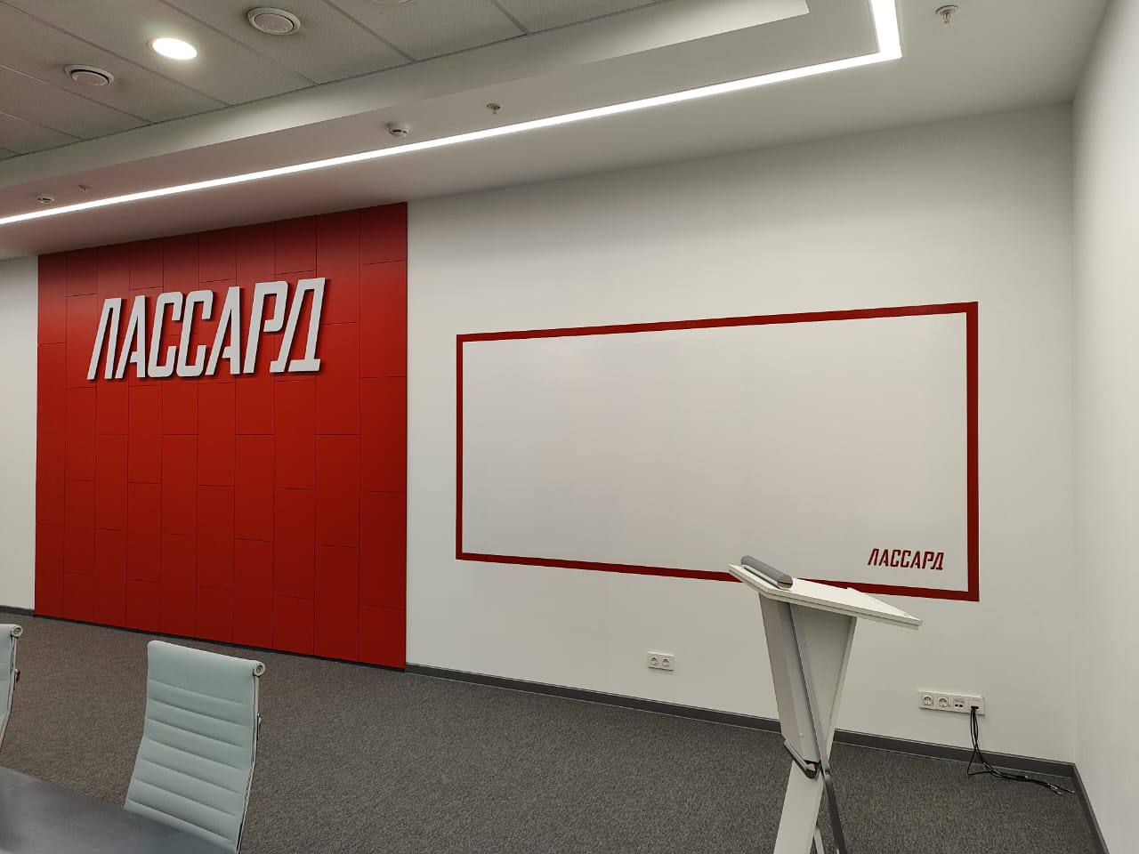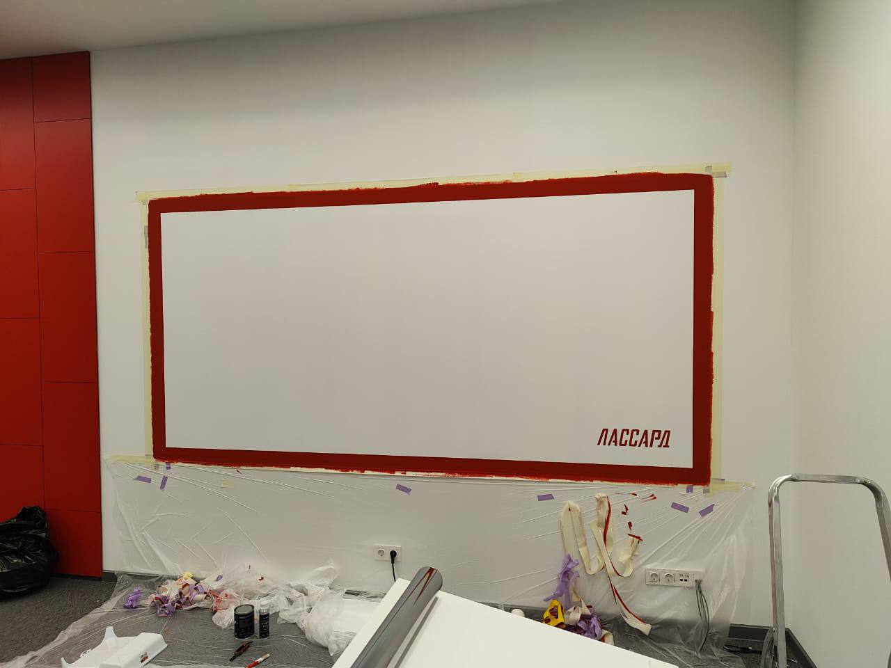 На магнитно-маркерной стене был выполнен логотип Лассард, нанесённый под трафарет.