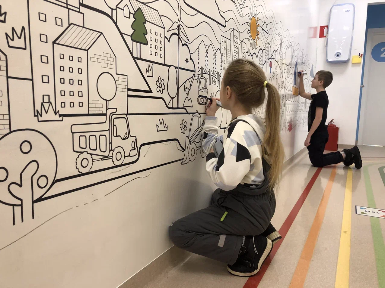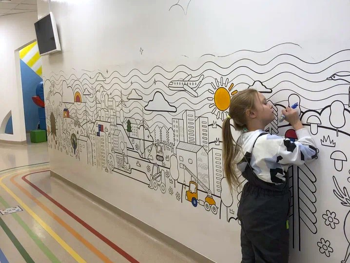 В детской зоне клиники DocDeti на Ломоносовском проспекте мы создали маркерную раскраску под трафарет. Чёткие контуры рисунков позволяют детям раскрашивать их маркерами, развивая воображение и моторику.