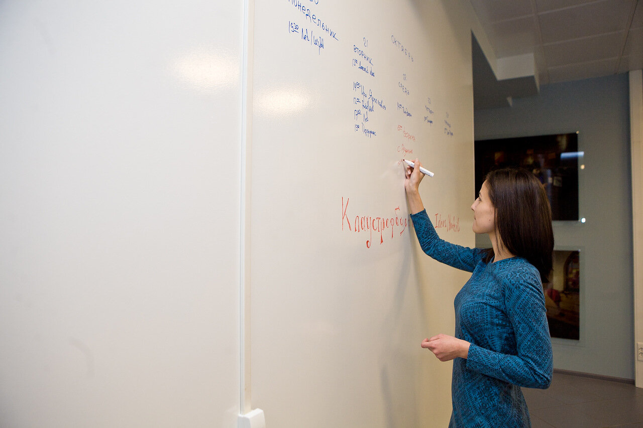 В офисе «Клаустрофобия» мы нанесли белое маркерное покрытие на стену в коридоре, превратив её в интерактивное пространство для записей, планирования и визуализации идей.