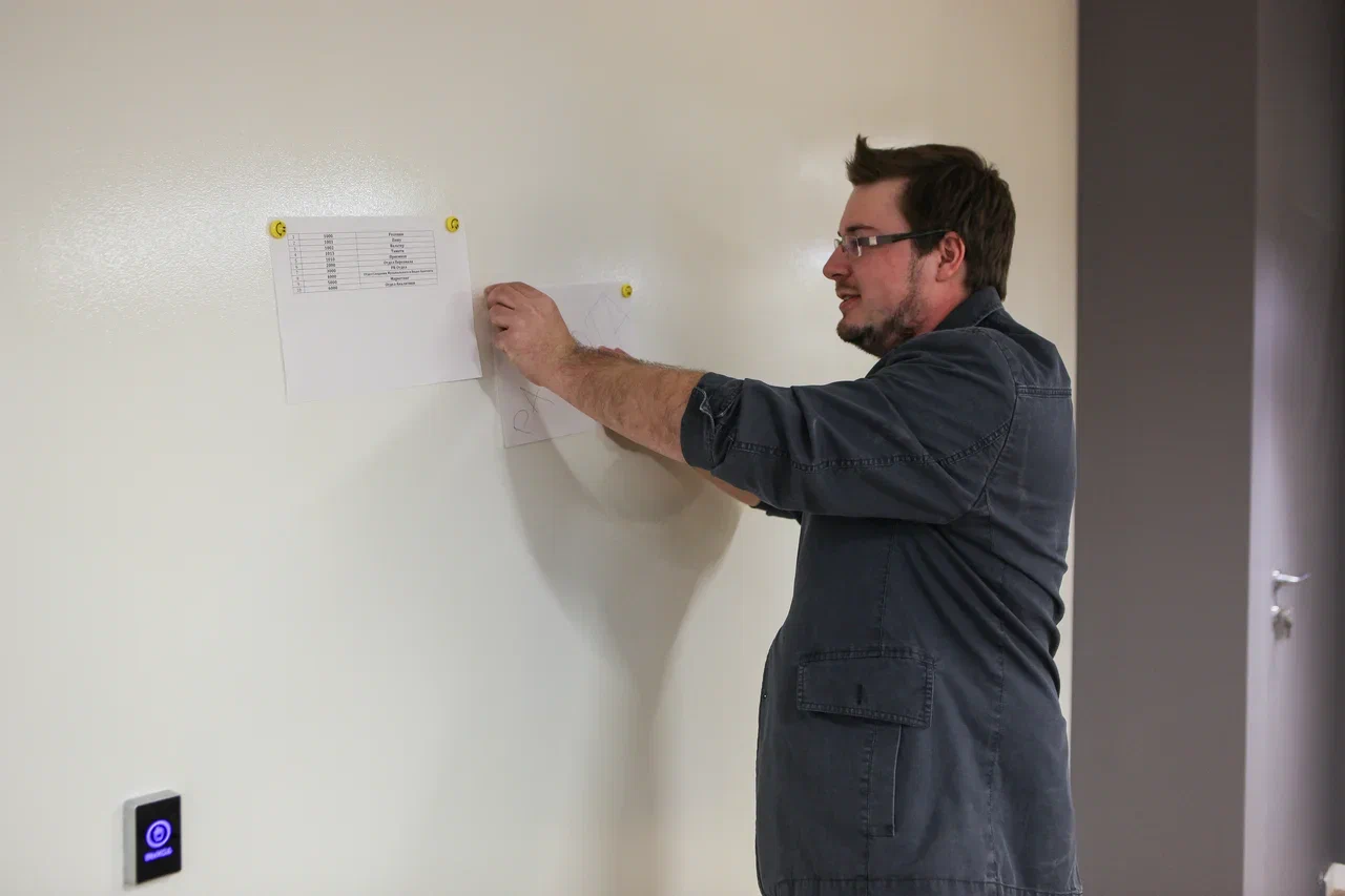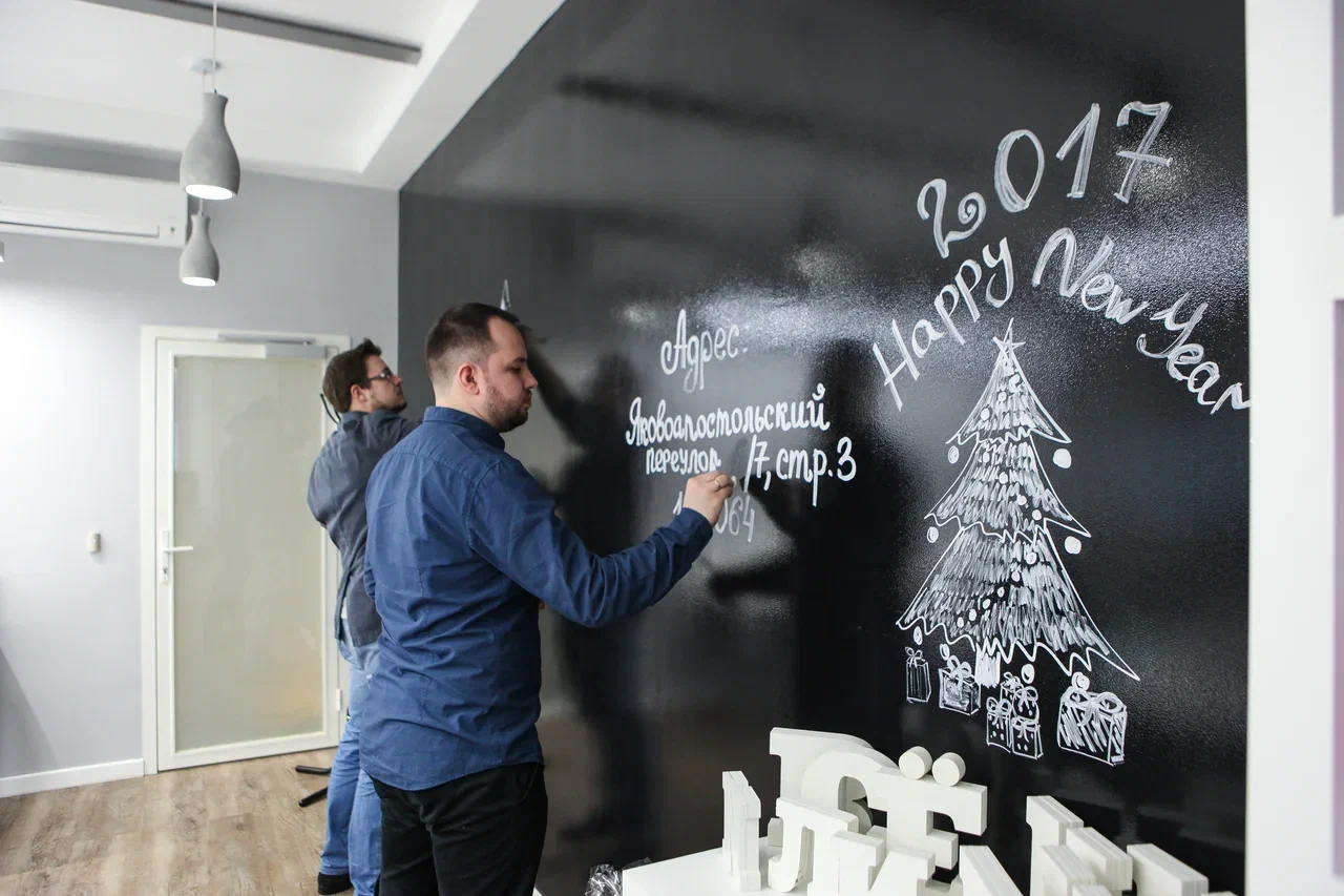 В одной из переговорных офиса Black Star мы создали черную магнитно-маркерную стену с прозрачным покрытием Siberia Marker Touch. Сначала стену окрасили в насыщенный черный цвет, а затем нанесли прозрачное покрытие, чтобы поверхность стала удобной для письма маркерами и работы с магнитами.